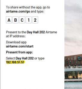 Open the AirTame app and type in the IP address shown on the projector screen. The images below are an example of connecting to the AirTame in Day Hall 202.